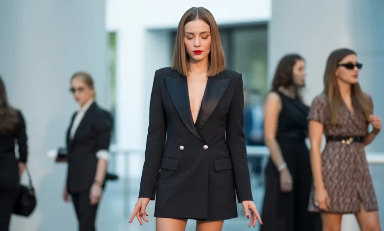 Der Trick ist, ihn mit Mode zu kombinieren, die ähnlich clean ist: schwarze Blazer, tiefe Ausschnitte, rote Lippen – der Kontrast funktioniert einfach.