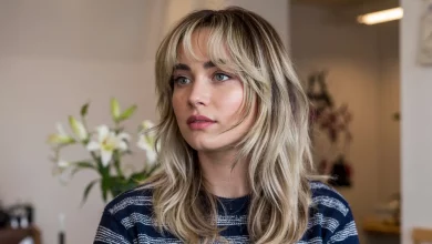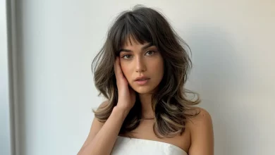 Dieser Schnitt kommt ohne viele Produkte aus, aber ein leichtes Volumenspray am Ansatz kann Wunder wirken. Ich liebe z. B. das „Root Lift Spray“ von Maria Nila – vegan, nicht klebrig, einfach gut. Für den Glanz reicht ein Tropfen Öl in die Spitzen.