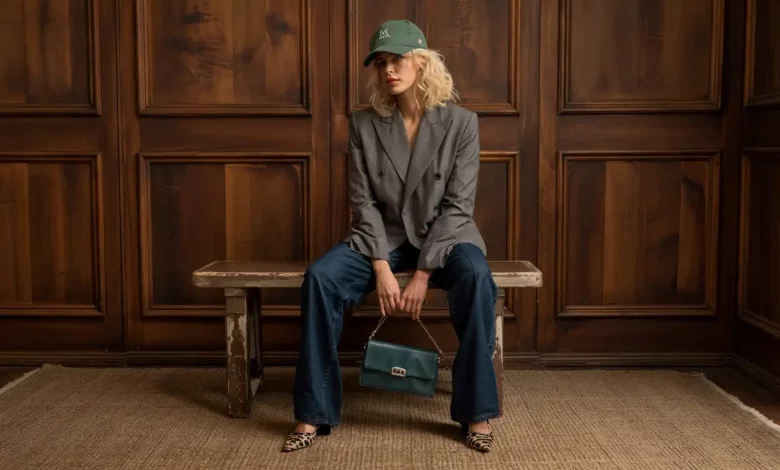 Hier kommt die edgy Variante eines business casual damen 2025-Looks: Dunkler Blazer, schwarze Wide-Leg-Hose, dunkles Shirt – dazu eine Cap in Waldgrün, ein strukturierter Lederbeutel in Petrol und Leoparden-Mary-Janes mit Schnalle. Es wirkt fast wie eine Mode-Redakteurin auf Sneakerpause.