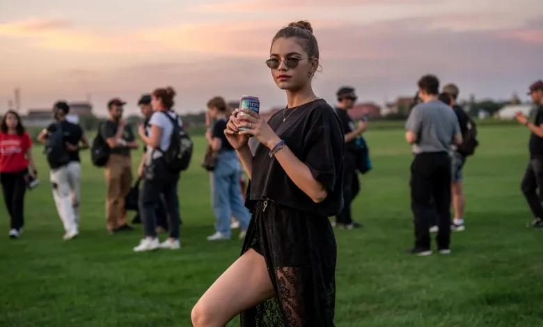 Große Boots, oversized Trikotshirt, Statement-Ringe und ein Bandana – dieser Look schreit geradezu nach coachella outfit 2025. Und er zeigt deutlich: Festival heißt nicht automatisch Boho oder Glitter. Hier kommt ein Style, der auf Nonchalance basiert und trotzdem wirkt, als wär er stundenlang perfekt abgestimmt worden.