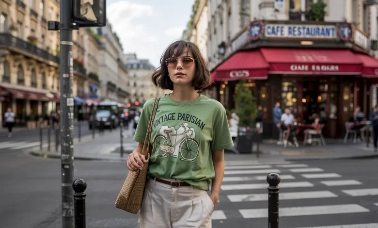 Dieses Outfit ist Paris pur. Ein apfelgrünes Cropped-Shirt mit Vintage-Motorradprint, kombiniert mit einem fließenden Rock aus Seidensatin in Cremeweiß – feminin, frech, französisch. Der Zebra-Tote-Bag bringt Muster mit, die feine Sonnenbrille komplettiert den Look.